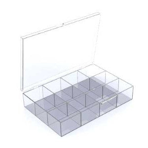 Twelve Compartment Box - All Plastic Twelve Compartment Box with plastic hinge and lid. Ideal for storing jewellery parts, jewellery findings, clock parts, watch parts. A great organizatinal tool for all your inventories and spare parts. Dimensions: 7 1/2" x 5" x 1 1/4".