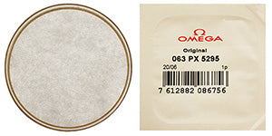 31.62 mm x 4.35 mm (height) round plastic crystal with gold colour ring, genuine 063PX5295 Omega® crystal, fits Omega® case REF 1660209, 1661242, 1661243, 3660847