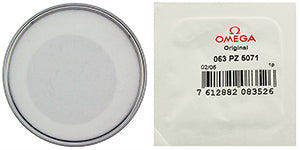 30.60 mm x 5.40 mm (height) round plastic crystal with steel colour ring, genuine 063PZ5071 Omega® crystal, to fit Omega® case REF 135010, 135010SP, 1355010, 1360010, 136010, 136010SP, 1365010, 1683006, 1685415, 644841