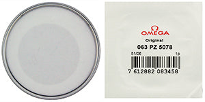 34.12 mm x 4.50 mm (height) round plastic with steel colour ring, genuine 063PZ5078 Omega® crystal, fits Omega® case REF 1050002, 105002, 11002, 11003-2, 1450002, 145002, 1450039 2026, 2915, 2998, 6049