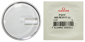 31.62 mm x 5.00 mm (height) round plastic crystal, steel colour ring with day & date calendar loupe, genuine 063PZ5111LL Omega® crystal, fits Omega® case REF 1660032,166022, 166032, 1680016, 1680023, 168016, 168023, 6159, 6162
