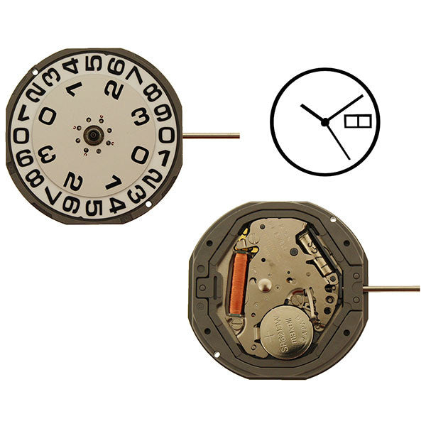 1M50 Miyota Quartz Watch Movement is a 3 hand movement (hour / minute / seconds) with BIG DATE @ 3 o'clock position. This gents movement is a 10 1/2 ligne movement, dimensions are 23.30 mm with a thickness of 2.94 mm, overall height 4.39 mm. Hand dimensions are 120/70/17 (h/m/s). 0 jewel movement, uses 364 battery. Stem is part number 065-505 (tap 0.90 mm/ tap 10).