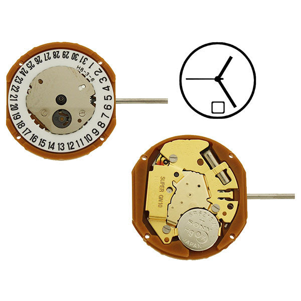 GN10 Date 6 Miyota Quartz Watch Movement is a 3 hand movement (hour/minute/second) with date @ the 6 o'clock position. Movement is a 8 3/4 ligne movement, 20.00 mm x 18.00 mm with a thickness of 2.71 mm, overall height 4.17 mm. Hand dimensions are 120/70/17 (h/m/s). 0 jewels, uses 364 battery. Use stem part number 065-547 (tap 0.90 mm / tap 10).