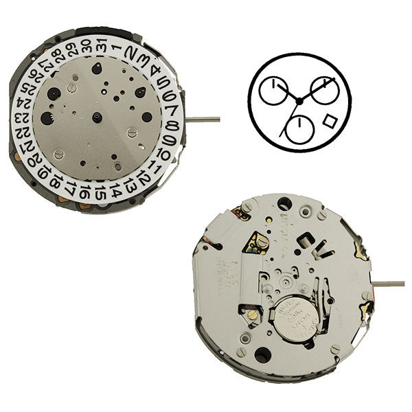 JS05 Miyota Quartz Watch Movement is a 2 button "Stopwatch" chronograph movement with 3 hands in the center, 3 indicators and a date window at 4 o'clock suspended. The indicator at the 2 o'clock position records 24 hours, the indicator at the 6 o'clock position records seconds (stopwatch function), and the indicator at the 10 is a 60 minute register. This is a 12 1/2 ligne movement with a dimension of 28.20 mm x 26.00 mm with a movement thickness of 4.30 mm. Total height for this movement is 6.11 mm. Hand dimensions are 120/70/17/26 (hour/minute/sweep second/indicators). 0 jewels, uses 364 battery. Use stem part number 065-505.