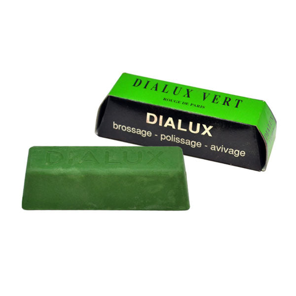 Dialux Green Polishing Compound Premium polishing compounds. Made from select abrasive grades, uniformly blended and manufactured under the most strict quality controls. Adheres exceptionally well to buffs, brushes and felts. Very little is needed, which helps reduce cleanup and saves time. Individually packaged in colour-coded cardboard boxes for cleaner handling. Each bar measures 3-5/8"L x 1-1/8"W x 1"H and weighs approximately 4 oz. Dialux Green Polishing Compound provides bright polishing of hard allows; such as platinum, white gold, chrome, chrome cobalt, and stainless steel.