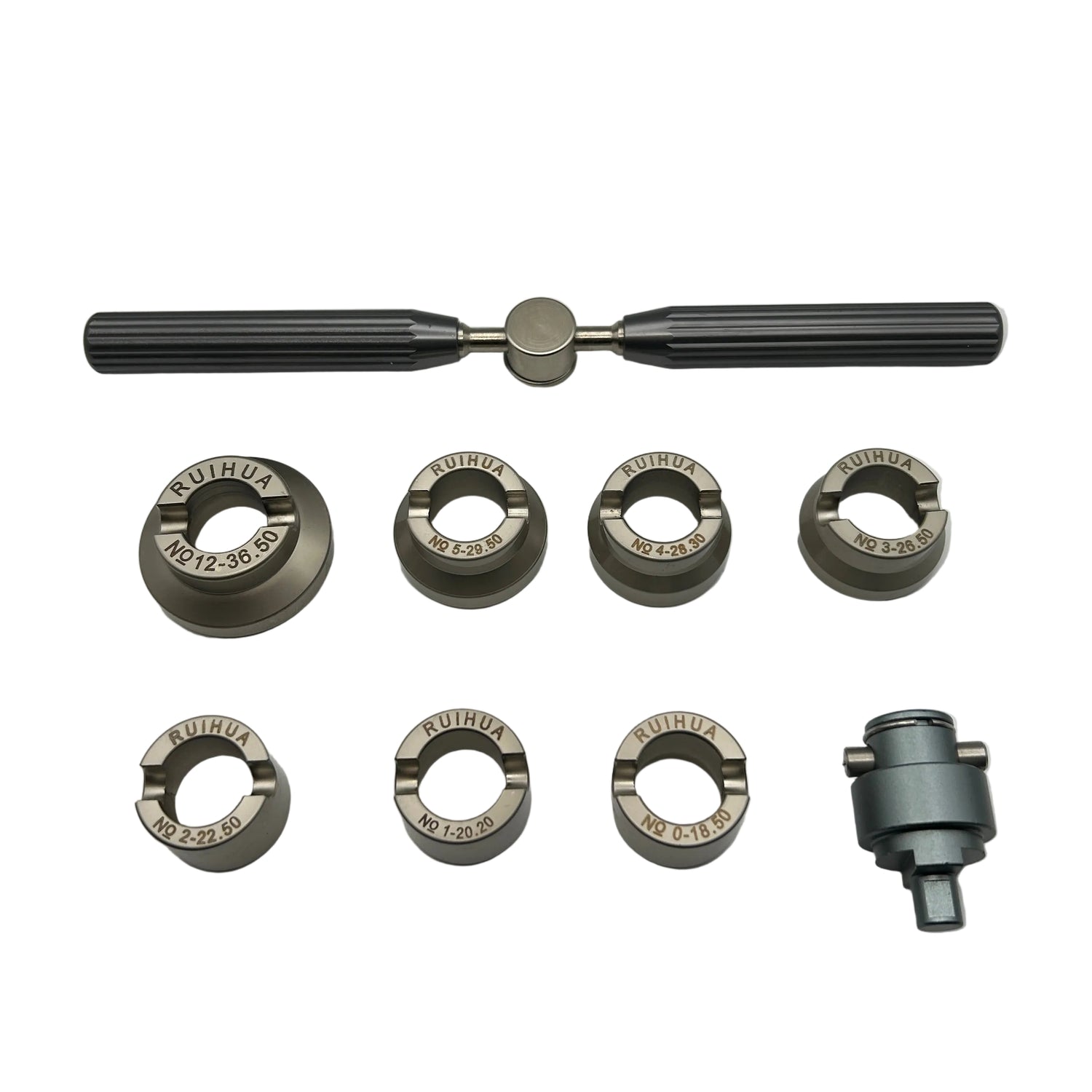 This Economy Line RLX-style case back opener comes with 7 grooved dies, an ergonomic handle for manually opening case backs, and an adaptor for opening case backs with a case opening press.