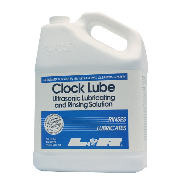 L & R Clock Lube This is an ultrasonic lubricating and rinsing solution. Used in conjunction with the LR-677 clock cleaning solution. This solution will rinse and lubricate the clock movements that have been cleaned, saving the clock maker time. To be used with LR-677 solution. L & R Clock Lube is 1 US gallon.