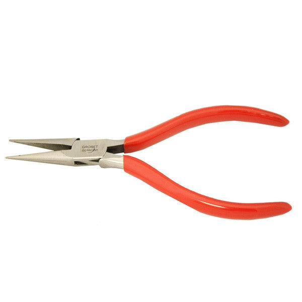 Smooth Chain Nose Plier 5.25 inches from the Pro-Line Series Box Joint Pliers and Cutters, this plier is made in Germany. Standard weight pliers and nippers with box joints, highly polished finish and plastic covered handles. Ideal for precision work! Jaws taper to 1/32" at tips and jaw edges are beveled to prevent marring soft wire. Used to make bends and for gripping and manipulating wires. This plier has an overall length of 5 1/4" with a 1 1/4" smooth jaw.