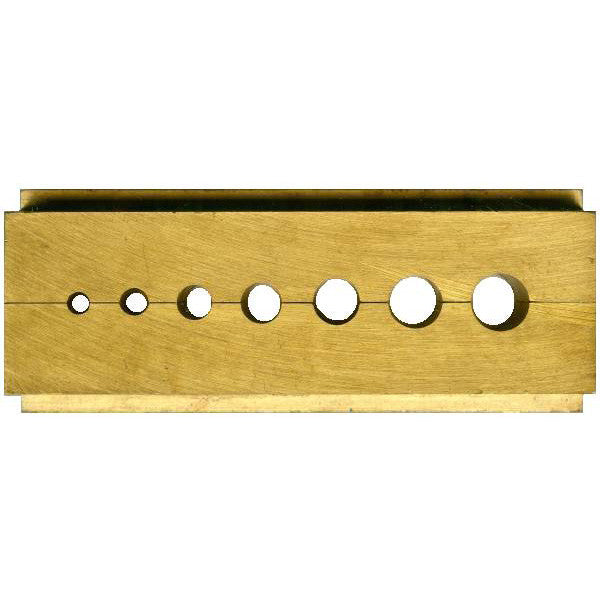 Split Stake Large for clockmakers. Large Split Stake constructed of brass with steel alignment pins, ideal for working on wheels. Large Split Stake slides open along the center line to allow wheel shafts to be inserted into an appropriate size hole. The stake can then be clamped into any bench vice to give maximum stability to the wheel. Large Split Stake has holes sizes 4.0 mm to 10.0 mm.