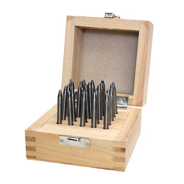 Staking Set For Watches and Clocks Staking Set for Watches and Clocks is an assortment of 25 staking punches for both the watch repairer, and the clock repairer. Punches are organized in a hinged wooden box. Made in India.