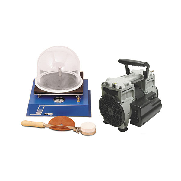 Standard Vacuum-Assist Machine for Investing and Casting When casting, the machine creates a vacuum at one end of the flask, which pulls the air and gases from the mold so that the molten metal flows quickly to every opening. Larger flasks can be cast with vacuum casting than with the centrifugal machine (although it is not possible to specify exact sizes, as the amount of metal to be cast, the shape of the cavity, etc., will all affect the size). This machine is capable of creating a negative mercury pressure equal to 27"-29" at sea level. The vacuum table measures 10-1/2" x 10-1/2" and rests on jiggle springs. 110 volt model. Unit comes complete. Shipping weight 50 lbs. Table without pump 18lbs. Pump (and oil) 29 lbs.