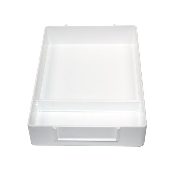 White Stackable Shop Tray An easy way to organize your work. Self-nesting for uniform stacking. Includes removable partition. Measure 6" x 9" x 1-1/2". Sold individually.