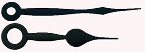 Pair of Hour and Minute Hands, Blue colour, Railroad style, heavy whip minute / heavy spade hour, length of minute 20.5 mm. To fit Waltham 18 size, hole size: 135/240 (minute/hour)