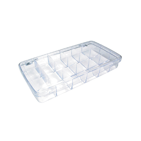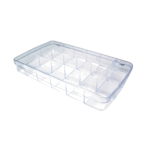 Plastic Box with 18 Compartments. 2 different sizes boxes are available. Choose either the 10 3/4" x 6 3/8" x 1 3/4" compartment box or the 8 1/4" x 4 1/8" x 1 1/4" compartment box from the dimensions tab.