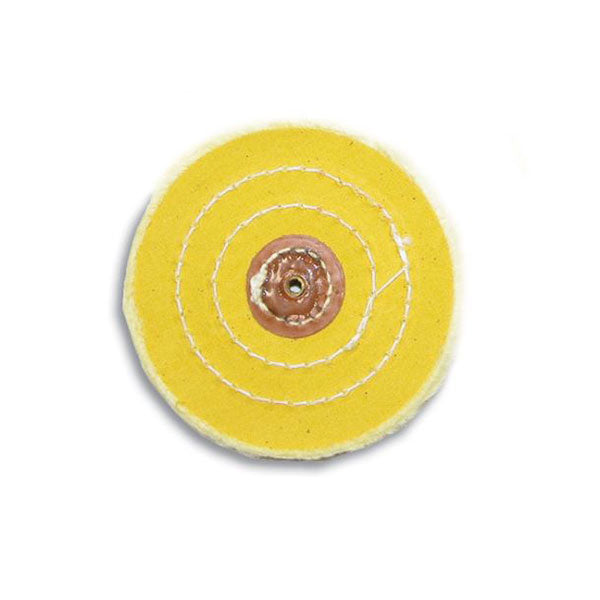 4" Diameter Chemkote Yellow Buffs with Leather Center More aggressive, treated muslin helps remove surface scratches from work. Excellent for use with tripoli and abrasive compounds. 4" diameter. 3 rows of stitching. 60 ply. Sold individually.