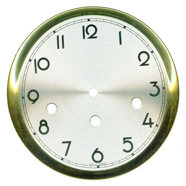 Regulator Type Dial 7 1/4" to fit FHS 350/351 has a yellow bezel, silver dial and black arabic numbers. Regulator Type Dial 7 1/4" has key hole positions to fit FHS 350, FHS 351, FHS 1050, FHS 1051 movements. It has an outside diameter of 183 mm or 7 1/4".