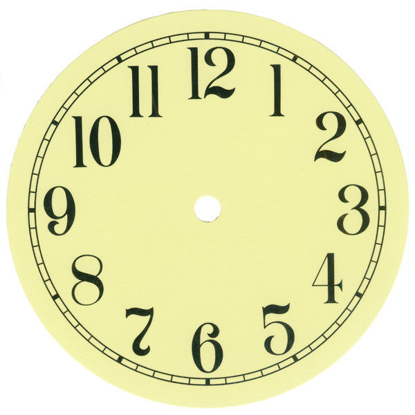 Aluminum Painted Dial 6" Arabic a painted aluminum dial that has an ivory face and black Arabic numerals. The dial has a diameter of 152.4 mm or 6".
