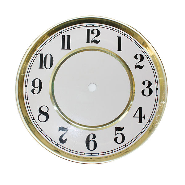 Economy Vienna Regulator Dial 6 1/2" Arabic is an affordable economy dial to be used with both quartz and mechanical movements. The center hole is cut, key hole positions are required to be cut when installing (if required). This dial measures 6 1/2" (165 mm), black arabic numerals, yellow bezel, white printed dial.