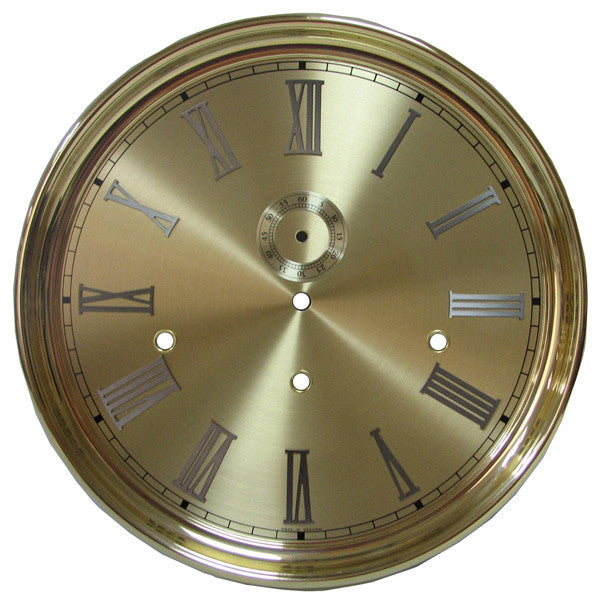 Round Grandfather Dial Hermle 1161.853BS made by FHS Hermle, excellent quality and finish. The round dial is gold in colour and has gold roman numerals a black minute track with second bits mounted. Hermle Round Grandfather Dial fits Hermle movement 1161.853BS. Diameter with the bezel included is 300 mm.
