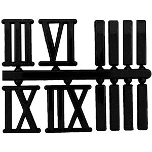 5/8" Roman of 3-6-9-12 & Dashes is a set of 3, 6, 9, and 12 with dashes to make a total package of 12 clock figures. These clock figures are 5/8" in size and are black in colour.