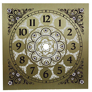 Gold Square Dial 4 1/2" Arabic is a gold aluminum painted square dial with a flower motif & black Arabic numerals. This square dial measures 114.3 mm (4 1/2"). The minute track is 95.2 mm (3 3/4").