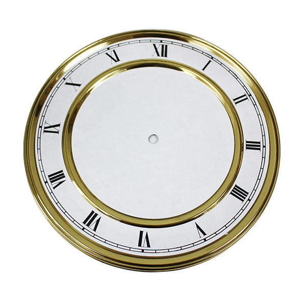 Economy Vienna Regulator Dial 10 1/2" Roman is an affordable economy dial to be used with both quartz and mechanical movements. The center hole is cut, key hole positions are required to be cut when installing (if required). This dial measures 10 1/2" (267 mm), 9 1/8" time track, black roman numerals, yellow bezel, white paper dial.