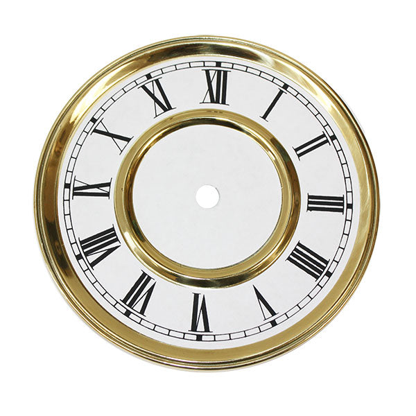 Economy Vienna Regulator Dial 5 7/8" Roman is an affordable economy dial to be used with both quartz and mechanical movements. The center hole is cut, key hole positions are required to be cut when installing (if required). This dial measures 5 7/8" (149 mm), 4 7/8" time track, black roman numerals, yellow bezel, white paper dial.