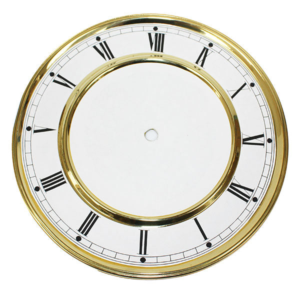Economy Vienna Regulator Dial 8 3/8" Roman is an affordable economy dial to be used with both quartz and mechanical movements. The center hole is cut, key hole positions are required to be cut when installing (if required). This dial measures 8 3/8" (213 mm), 7" time track, black roman numerals, yellow bezel, white paper dial.