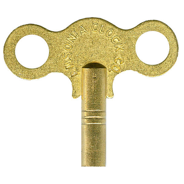 Ansonia SE #6 Clock Key is a brass, American, Single End, #6 Ansonia Clock Key with trademark and logo. The hole size measures 3.6 mm.