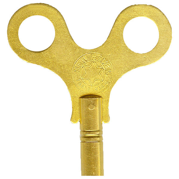 New Haven SE #6 Clock Key is a brass, American, Single End, New Haven #6 Clock Key with trademark and logo. The hole size measures 3.6 mm.