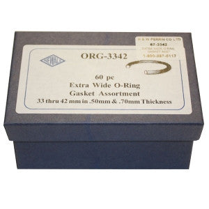 Extra Wide O-Ring Gasket Asst this is an extra wide o-ring gasket assortment that contains 60 gaskets of sizes ranging from 33 to 42 mm in 0.50 and 0.70mm thickness.