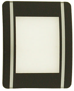 22.50 mm x 18.00 mm x 0.90 mm (thick) rectangular curved (12 to 6) mineral crystal, black trim with silver lines on 3/9 sides, generic (not original) to fit Rado®. Using generic crystals may devalue your watch.
