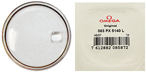 29.62 mm x 4.00 mm (height) round plastic crystal, gold colour ring with calendar loupe, genuine 063PX5140L Omega® crystal, fits Omega® case REF 101442, 101476, 11088374, 135005, 1360005, 136005, 136010, 14324, 14328, 14350, 14355, 14363, 14365, 14368, 14