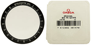36.00 mm x 2.50 mm (thick) flat mineral crystal with black trim, white markings “TELEMETER”, genuine 063TN5219TE Omega® crystal, fits Omega® case REF 1450034, 1450037