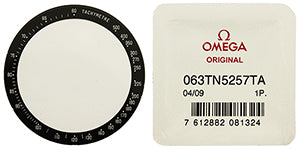 34.00 mm x 2.00 mm (thick) flat mineral crystal with black trim, white markings “TACHOMETER”, genuine 063TN5257TA Omega® SPEEDSONIC crystal, fits Omega® case REF 1880001, 3880800