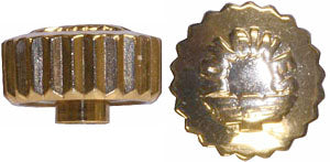 yellow, thin square, short pipe with “wings” and name logo, diameter 3.75 mm, height of crown only 1.75 mm, total height of crown 2.35 mm, opening diameter to tube crown fits 2.00 mm, tap 0.90 mm
