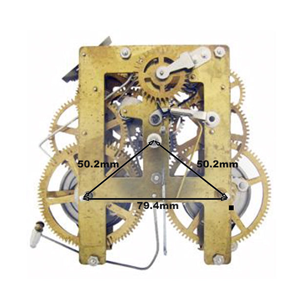 8 Day Kitchen Mvmt is an 8 day "economical" kitchen clock movement with a count wheel strike. The movement measures 6 1/2" x 6" x 2 7/8" with a hand shaft length of 1 1/16". 8 Day Kitchen Mvmt looks like old Waterbury or Seth Thomas movements and comes with a key and one pair of hands. Pendulum is not included with the movement. Actual plate size is 3 3/4" x 5 1/4". The pendulum drop is aprox. 9 inches below the hand shaft.