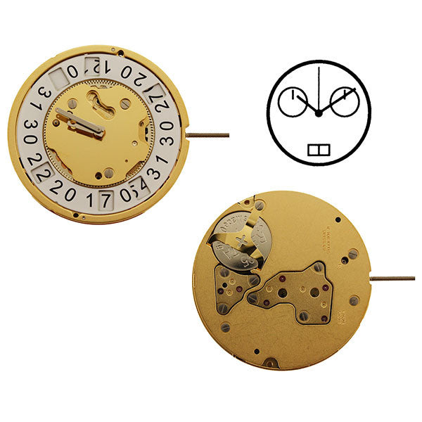 RL5020B Swiss Ronda Startech Quartz Movement is a 3 hand (hour/minute/sweep seconds) Swiss assembled with 1 Chronograph indicator (hour and minute recording) at the 10 o'clock position, and an additional Chronograph indicator (seconds recording) at the 2 o'clock position plus LARGE DATE at the 6 o'clock position. This gents movement is a 12 1/2 ligne movement, dimensions are 28.00 mm in diameter with a height of 4.40 mm. This is a 10 jewel movement, gilt plates, using a 395 battery. The large hands at the center of the movement (hour/minute/seconds) have dimensions 150/90/25 (hour/minute/seconds). The chronograph indicator at the 10 o'clock position has two small hour counting and minute counting hands with dimensions 0.80/0.40 mm (hour/minute). The chronograph indicator at the 2 o'clock position has a small seconds recording hand with a dimension of 0.20 mm. The date appears at the 6 o'clock position using ten's and units (2 windows).