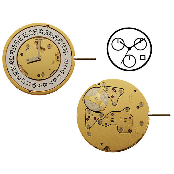 RL 5030D Swiss Ronda Startech Quartz Movement is a 3 hand (hour/minute/sweep seconds) Swiss assembled with 3 Chronograph indicators and regular date at the 4:30 position. The indicator at the at the 2 o'clock position records seconds, the indicator at the 6 o'clock position records hours, the indicator at the 10 o'clock position records minutes. This gents movement is a 12 1/2 ligne movement, dimensions are 28.00 mm in diameter with a height of 4.40 mm. This is a 13 jewel movement, gilt plates, using a 395 battery. The large hands at the center of the movement (hour/minute/seconds) have dimensions 150/90/25 (hour/minute/seconds). The chronograph indicators all have a dimension of 0.20 mm. The date appears at the 4:30 position.