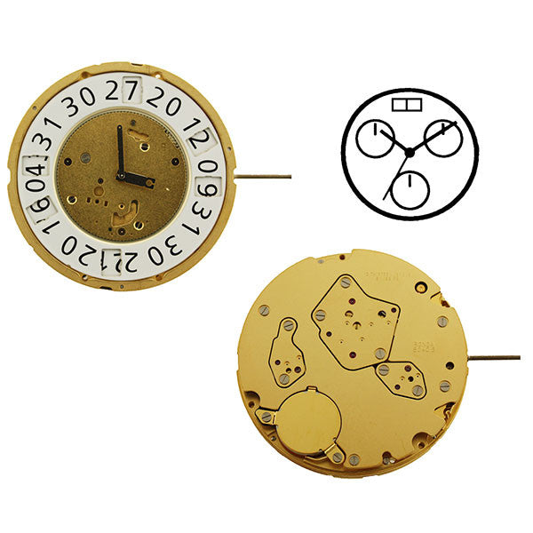 RL8040B Swiss RL8040B Swiss Ronda Mastertech Quartz Watch Movement is a Swiss assembled Chronograph Watch Movement. This quartz movement has 3 hands in the center: hour/minute/sweep seconds, 3 indicators: 1/10th second @ 3, small seconds @6, 30 minute register @9, and a BIG DATE at the 12 o'clock position. This movement is a 15 ligne movement, with a diameter of 34.60 mm and a movement height of 5.60 mm. Movement is yellow in color, has 13 jewels, and uses a 395 battery. The dimensions for the hands are as follows: hour/minute/sweep second (150/90/25), all 3 indicators (20). The BIG DATE at the 12 o'clock position consists of 2 windows: tens & units.
