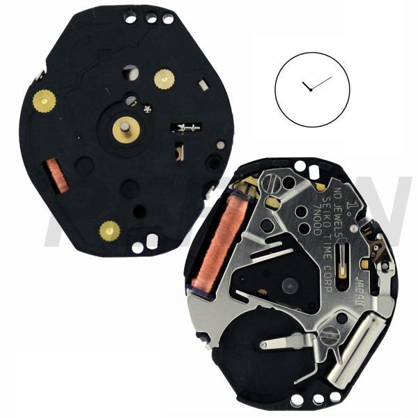 7N00 10 Seiko Quartz Watch Movement is a 2 hand movement (hour/minute). This ladies movement is a 6 3/4 x 8 ligne movement, dimensions are 15.30 mm x 17.80 mm with a thickness of 2.19 mm, overall movement height is 3.30 mm. Hand dimensions are 110/65(h/m). 0 jewel movement, uses 321 battery. Stem is supplied with the movement. Stem is a part number 351-890, this stem is a tap 0.80 mm (tap 11).