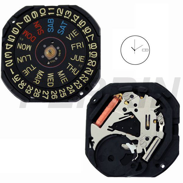 7N33 20 Seiko Quartz Watch Movement is a 3 hand movement (hour/minute/sweep second) with day and date at the 3 o'clock position. These calendar disks are gold figures on black background. This gents movement is a 10 1/2 ligne movement, dimensions are 21.30 mm x 21.50 mm with a thickness of 2.78 mm. Total height of the movement is 4.79 mm. Hand dimensions are 110/65/20 (h/m/s). 0 jewel movement, uses 370 battery. Stem is supplied with the movement. Stem is a part number 351-892, this stem is a tap 0.80 mm (tap 11).