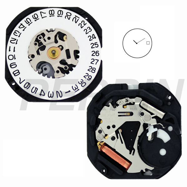 7N39 10 Seiko Quartz Watch Movement is a 2 hand movement (hour/minute) with date at the 3 o'clock position. This gents movement is a 10 1/2 ligne movement, dimensions are 21.30 mm x 21.50 mm with a thickness of 2.57 mm. Overall movement height is 3.80 mm. Hand dimensions are 110/65 (h/m). 1 jewel movement, uses 371 battery. Stem is supplied with the movement. Stem is a part number 351-892, this stem is a tap 0.80 mm (tap 11).