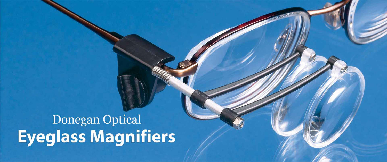 Donegan USA Double Lens Spectacle Loupes The Ultra-Light Eyeglass loupe is designed for maximum comfort and utility. Lenses are of high quality, optical-grade materials from precision ground and polished molds. Very lightweight and tough materials provide superior durability. The lens pivots out of the way for normal viewing and easily aligns when magnification is needed. Changeable cams are included to fit eyeglass frames from 1/16" to 1/4" temple width. The eyeglass clamp easily converts from right to left temple mounting.