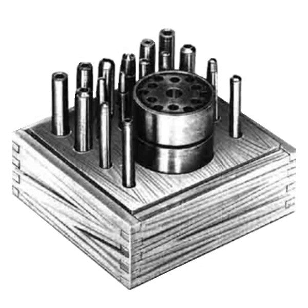 Set of Punches for Clockmakers 16 assorted punches with drilled centers. Set of Punches for Clockmakers cover a range of diameters and have flat, rounded or hole closing ends. Also included in Set of Punches for Clockmakers is a round steel anvil stake with 10 holes. Supplied with a wood base.