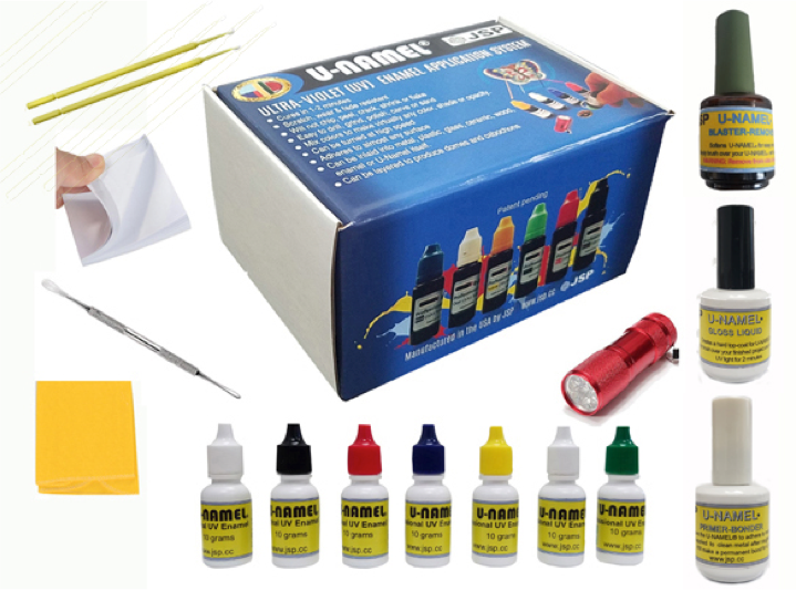 9 LED UV light with Spatula, Micro applicators, polishing cloth mixing pad. It cures in 1-2 minutes. Scratch & wear resistant. Does not chip, flake, peel or shrink. Easy to drill, grind, polish, carve & sand. Can be turned at high speed. Easy to mix, colours won't fade. Can be inlaid into metal, glass, plastic, ceramic, enamel or U-namel. Adheres to flat surfaces. Can be layered to produce cabochons. Non-hazardous. Includes, one bottle of each, bonding liquid, final polish & remover.