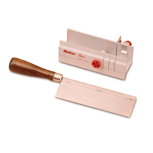 Matt Miter Box Slice bars, rods and wax ring tubes into tablets with perfectly straight and parallel walls or tapered slides. The ring tube is held firmly in position inside the box so there is no strain on your hand. With stop/ lock feature for cutting several tablets of the same thickness. The fine steel sawblade allows you to cut through the tube with no effort, leaving a smooth finish that does not require any filing. Set includes extruded aluminum 6" x 2" miter box, steel hand saw and stop/ lock.