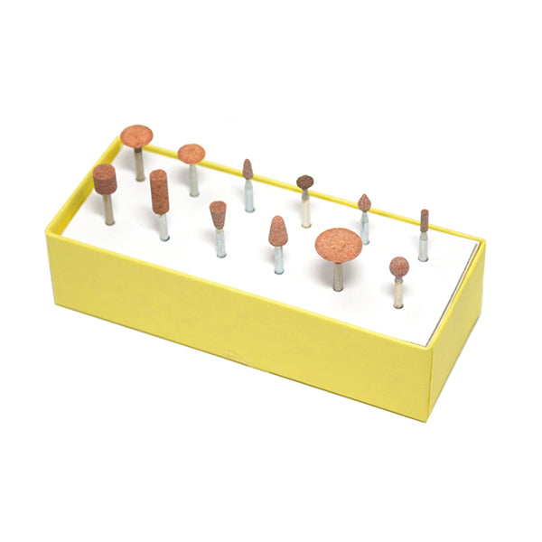 Set of 12 Mounted Ruby Crystal Points Fast cutting, tough points and cones for accurate grinding of steel, porcelain and glass, as well as for soft and precious metals. Shapes are securely mounted on 3/32" mandrels for use on flexible shaft machines. Set contains one each of the most popular points: 11-502/1, 11-507/1, 11-508/1, 11-510/1, 11-512/1, 11-513/1, 11-518/1, 11-520/1, 11/524/1, 11-525/1, 11-526/1, and 11-530/1.