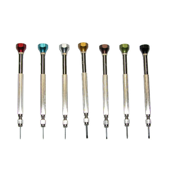 Screwdriver Set X7 a set of seven, numbers numbers 3 to 9 for baguette and pocket sizes, in a box. Designed especially for watchmakers. Nickel-plated to prevent rust. Reversible, double-ended blades and threaded ferrules for easy replacement. Color identified heads for quick selection.Set of seven, numbers 3 to 9 for baguette and pocket sizes, in a box. Designed especially for watchmakers. Nickel-plated to prevent rust. Reversible, double-ended blades and threaded ferrules for easy replacement. Color identified heads for quick selection.