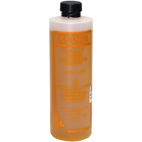 Krohn Rhodium The rhodium deposited from Krohn Decorative Rhodium Solutions exhibits a hard, brilliant white, non-tarnishing, highly reflective surface. These properties impart a long lasting high luster finish to fine jewellery. Pint contains one gram of rhodium.